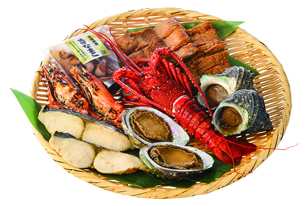 天然えび塩焼き×2、天然あわび煮付×2、天然サザエ醤油煮×2、